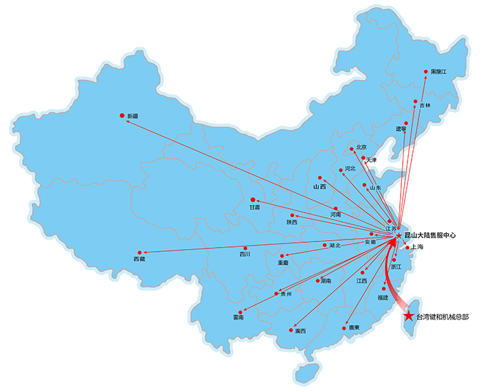 昆山嘉尼赫機(jī)械有限公司為臺(tái)灣鍵和機(jī)械股份有限公司在大陸設(shè)定的唯一子公司,本公司于2010年4月在昆山仕泰隆模具城成立,應(yīng)市場需求于2015年2月搬遷至昆山周市鎮(zhèn)成立鍵和中國售服中心。設(shè)有獨(dú)立的零配件倉庫及機(jī)臺(tái)大修車間,機(jī)臺(tái)樣機(jī)展示廳。